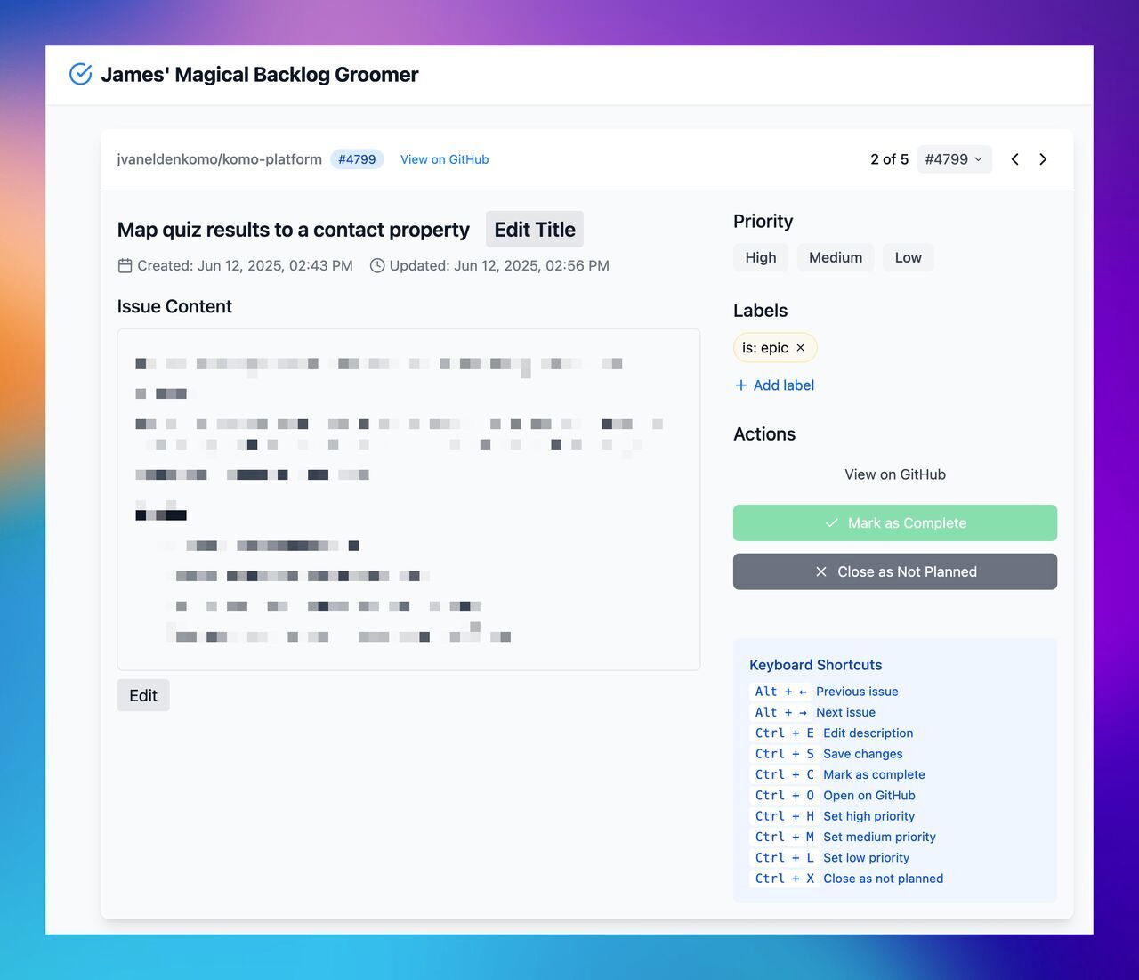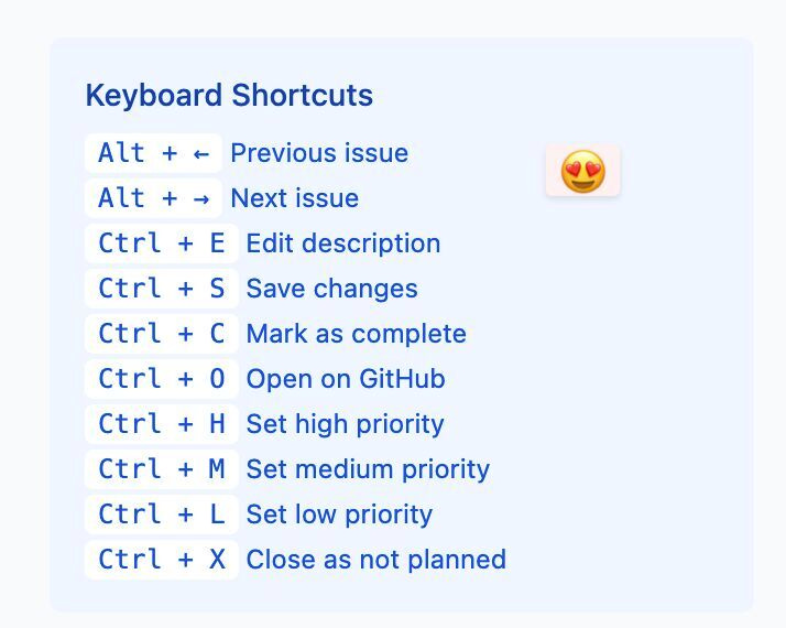 in just a few hours, i was able to easily plug into the github api, fetch specific batches of issues, and design my own perfect dream UI. everything is driven by keyboard shortcuts, arrow-key navigation through issues, no extra tabs or loading. exactly how i want it.