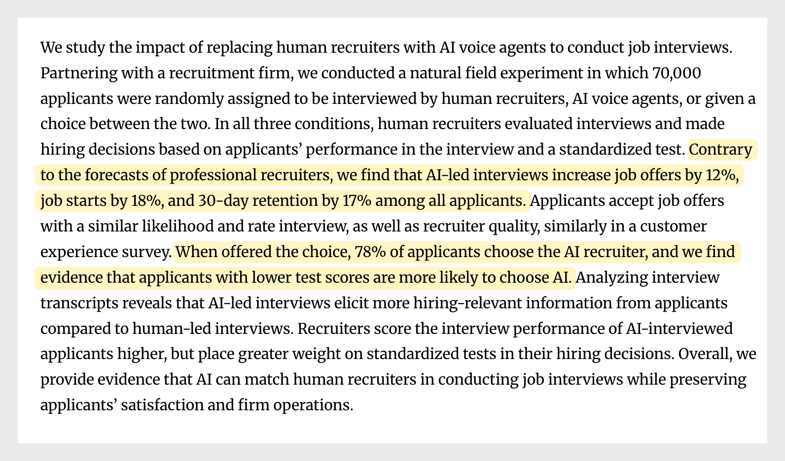A real-world experiment with over 70,000 applicants, using AI voice agents instead of human recruiters led to more job offers, higher job start rates, and better retention. What does this mean?